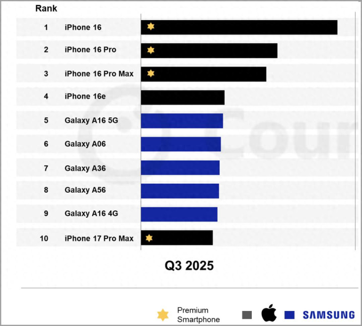 比较有趣的是,国内销量平平的 iPhone 16e 在全球范围内销量还是非常高的,此外后续推出的 iPhone 17 Pro Max 也凭借超高的首发销量勉强上了前十。