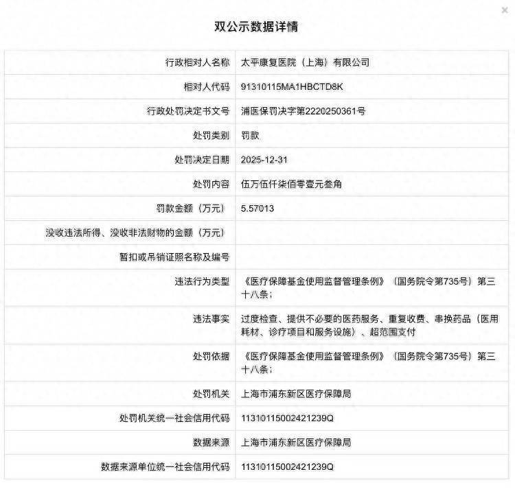 近日,太平康复医院(上海)有限公司因存在多项违反医疗保障基金使用管理规定的行为,被上海市浦东新区医疗保障局罚款人民币5.57013万元。